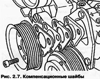 Калі раменныя шківы не супадаюць выраўнуйце адлегласць шківаў кампенсацыйнымі шайбамі таўшчынёй 0,6; 0,8; 1,0; 1,2 і 1,4 мм (мал. 2.7).