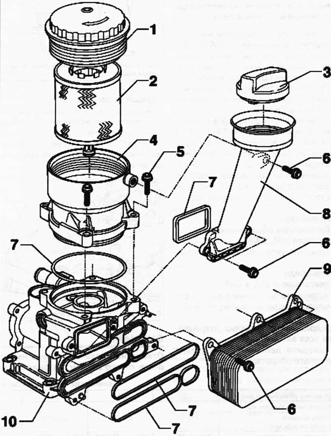 1 - вечка корпуса алейнага фільтра, 25 Нм; 2 - алейны фільтр; 3 - вечка; 4 - верхняя частка корпуса; 5 - ніт 8 Нм; 6 - ніт 10 Нм; 7 - ушчыльненне; 8 - заліўная гарлавіна; 9 - ахаладжальнік алею; 10 - ніжняя частка корпуса.