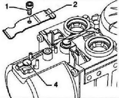 Unscrew screw "1" and remove spring "2". Using round-nose pliers, remove temperature sensor "G18" "3" and overheating sensor "G189" "4". Remove the wiring harness and disconnect the electrical connector.