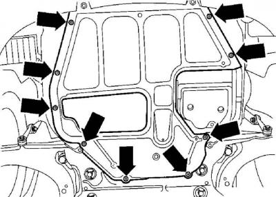 2. Вывинтите самонарезающие винты (указаны стрелками), которые крепят нижний брызговик двигателя.