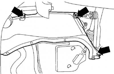 3. Ослабьте винты (указаны стрелками) и снимите боковые нижние брызговики моторного отсека.