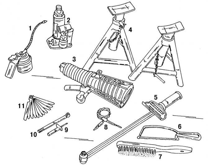 Rajz. 6. Javasolt szerszámok és tartozékok: 1 - olajozó; 2 - hidraulikus emelő; 3 - Elektromos hordozható lámpa; 4 - támasztékok; 5 - nyomatékkulcs; 6 - kis fémfűrész; 7 - drótkefe; 8 - ellenőrző lámpa (12 V); 9 - Abroncsprofil mélységmérő; 10 - gumiabroncs nyomásmérő; 11 - mérőszondák készlete