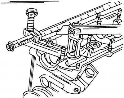 A szelepek ki- és beszerelésére szolgáló szabványos szerszám és beszerelési módja az ábrán látható. 394. A szerszám sarkának a szeleprugó-ülék belsejében kell lennie, különben a rugó nem szorul össze. Nyomja meg a szerszám karját, és nyomja össze a rugót, hogy a szelepszár-feleket le lehessen venni. A szelepek eltávolításához használhat egy csődarabot is, amely illeszkedik a felső rugólemezre. Valamit a szeleplemez alá kell helyezni a másik oldalon, hogy rögzítse. Röviden ütögesse meg a csövet egy kalapáccsal, amíg a szelepszár-felek ki nem jönnek. A cső belsejében maradnak. De ne szakítsa le a csövet a rugós lemezről, hogy ne veszítse el a szelepszár felét.