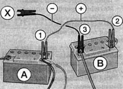Соединение обоих автомобилей с помощью вспомогательных пусковых проводов абсолютно необходимо осуществлять в следующей последовательности: