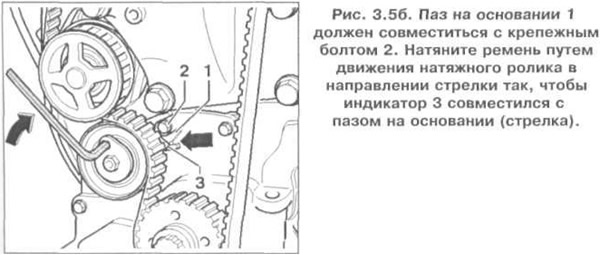 3. Установите натяжной ролик и затяните гайку крепления рукой (рис. 3.5 б). Паз на основании 1 должен совместиться с крепежным болтом 2. Натяните ремень путем движения натяжного ролика в направлении стрелки так, чтобы индикатор 3 совместился с пазом на основании (стрелка).