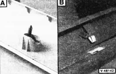 Зажим/пружинный зажим с задней стороны облицовки: облицовку в местах держателей зажимов отжать так, чтобы зажим «А» или соответственно пружинный зажим «В» вышел из отверстия в кузове.
