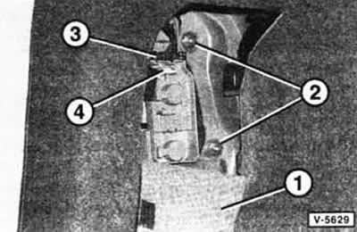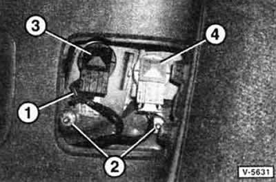 Отсоединить штекер «1». На рисунке показан левый задний фонарь при закрытой крышке багажного отсека. 3 — патрон лампы заднего противотуманного фонаря; 4—патрон лампы фары заднего хода.