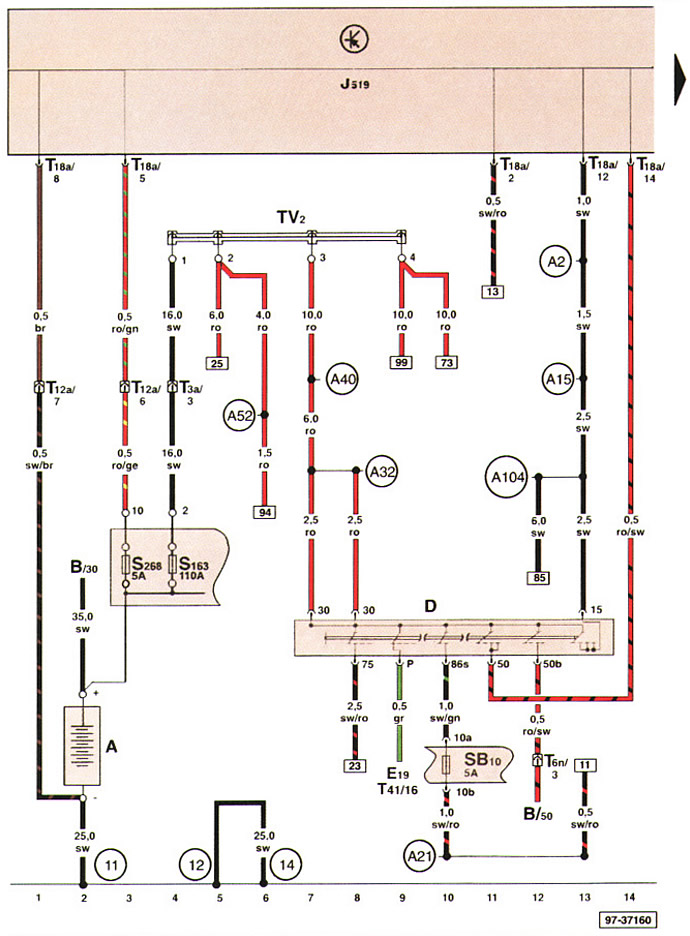Блок управления рулевой колонки, предохранитель SB16, выключатель стартера/зажигания