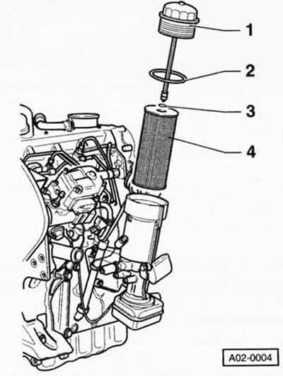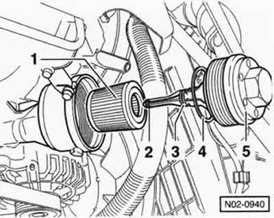 - Снять крышку вместе со сменным фильтрующим элементом «1». Пролившееся моторное масло собрать тряпкой.