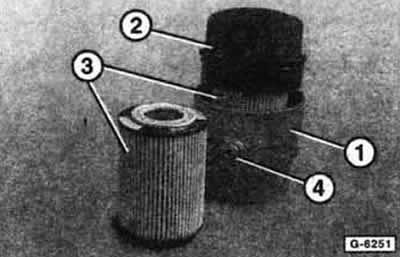 Масляный фильтр состоит из корпуса -1 -, крышки «2» и сменного фильтрующего элемента «3». Корпус фильтра приворачивается к блок-картеру двигателя вместо прежнего неразборного фильтра. В зависимости от изготовления на корпусе масляного фильтра имеется сливное отверстие с резьбовой пробкой «4». Сменные фильтрующие элементы разных производителей взаимозаменяемы независимо от конструкции фильтра.