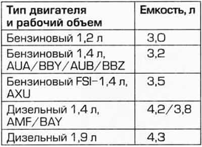 - В зависимости от двигателя 3...5 л моторного масла. Применять только разрешенные фирмами VW/ SEAT моторные масла.
