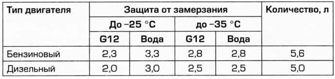 Примечание: в зависимости от оснащения автомобиля количество заливаемой охлаждающей жидкости может несколько отличаться от указанных в таблице значений.