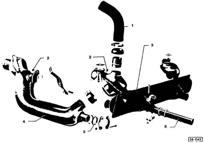Элементы системы выпуска: 1 - шланг системы отопления и вентиляции; 2 - самоконтрящиеся гайки; 3 - глушитель; 4 - теплообменник (проверить тепловую заслонку на легкость хода); 5 - уплотнительное кольцо (заменить); 6 - выхлопная труба (соблюдать глубину посадки)