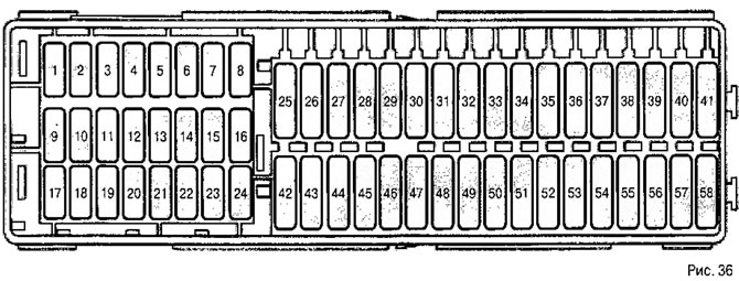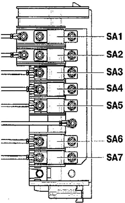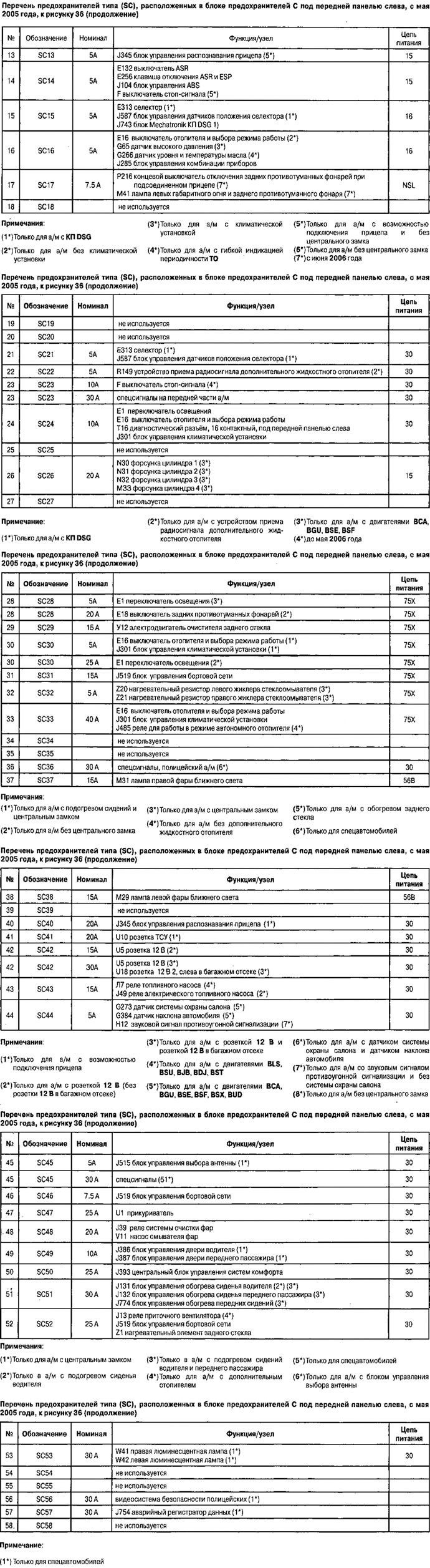 | 6 | SA6 | 100А | предохранители SC20-SC24 в блоке предохранителей С предохранители SC42-SC48 в блоке предохранителей С предохранители SC50-SC52 в блоке предохранителей С | 30 |