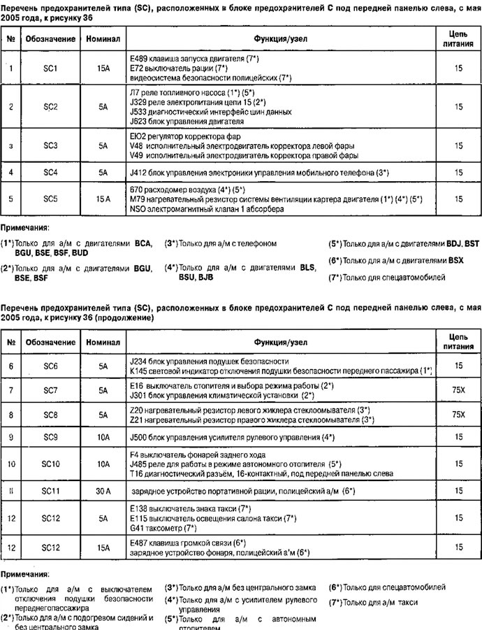 Перечень предохранителей типа SA, расположенных в блоке предохранителей А, с мал 2005 года