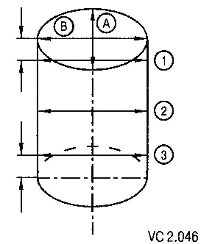 Замер следует производить примерно в 12 мм от нижнего края, под прямым углом к оси поршневого пальца. Максимально допустимое отклонение от номинального размера: 0,04 мм.