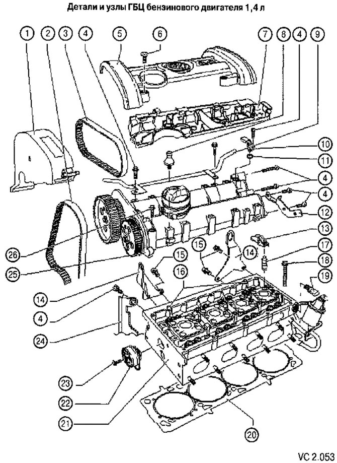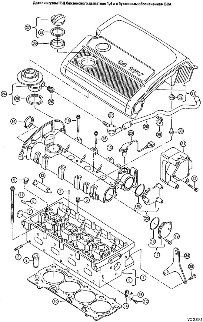 Перечень деталей и узлов ГБЦ бензинового двигателя 1,4 л с буквенным обозначением ВСА к рисунку VC 2.051