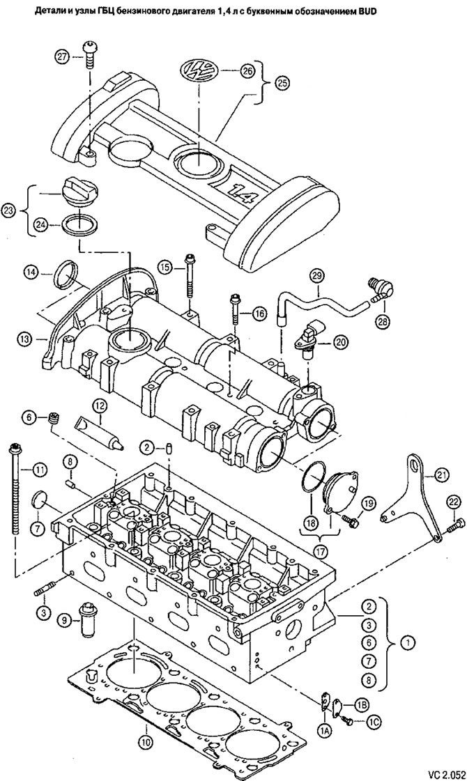 Перечень деталей и узлов ГБЦ бензинового двигателя 1,4 л с буквенным обозначением BUD к рисунку VC2.052