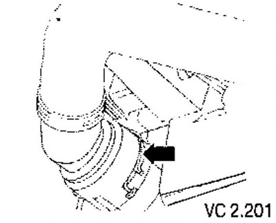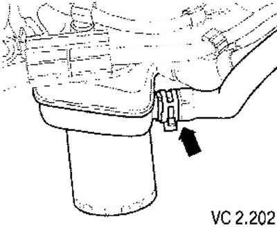 Внимание! На автомобилях без сливного вентиля снять фиксирующую скобу (стрелка) и отсоединить нижний шланг радиатора от радиатора.