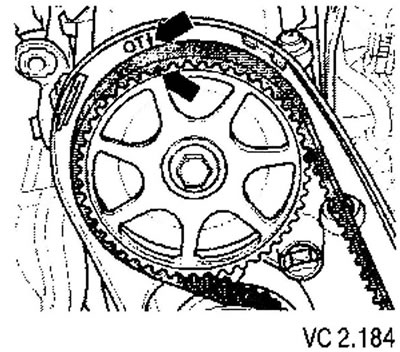 4. Установить зубчатый шкив распределительного вала в положение ВМТ первого цилиндра. Метка на зубчатом шкиве распределительного вала должна совпадать со стрелкой на кожухе зубчатого ремня.