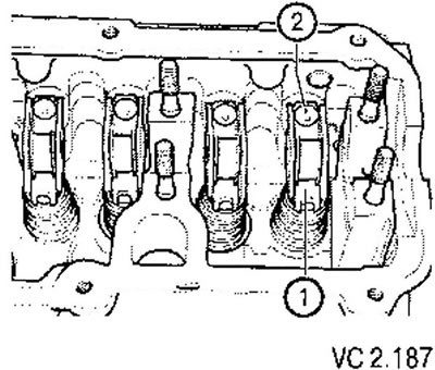 2. Роликовый рычаг должен правильно лежать на конце стержня клапана (1), а на соответствующей ему опоре (2) быть зафиксирован зажимом.