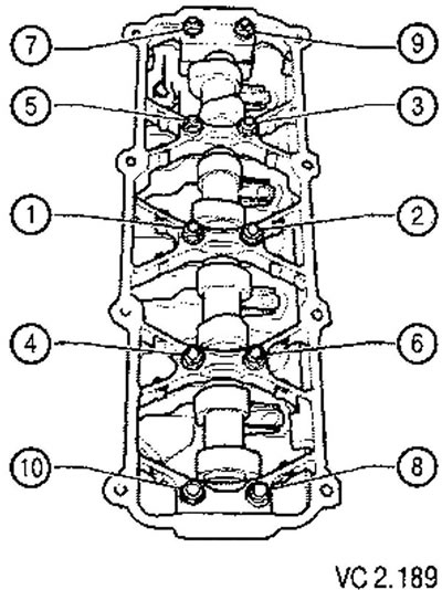 7. Установить раму распределительного вала и слегка притянуть, по очереди и крест-накрест, крышки опор №№ 2 и