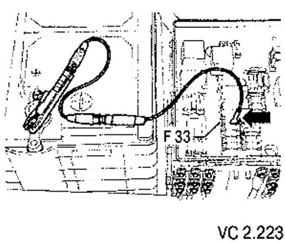 Извлечь предохранитель SB 33, находящийся в гнезде F 33 колодки предохранителей.