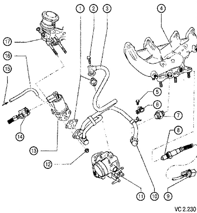 Перечень деталей и узлов приемной системы рециркуляции ОГ с технологическими замечаниями по ремонту к рисунку VC2.230: