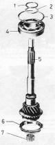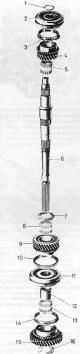 Главный вал (5 скоростей) — разборка и сборка* 1. Снимите с переднего конца вала его зажим. 2. Снимите синхронизатор 4/5 скоростей кольцо синхронизатора 4-ой передачи и шестерню 4-ой передачи. Если детали туго сидят на вале,...