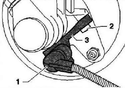 Deconectați bateria. Scoateți furtunul de admisie a aerului, carcasa filtrului de aer și bateria. Scoateți suportul bateriei. Deconectați conectorul electric "1" de la întrerupătorul luminii de frână "F". Scoateți șurubul "2" de la cilindrul principal de frână. Deconectați întrerupătorul luminii de frână "F" "3" din partea superioară a cilindrului principal de frână și scoateți-l din partea de jos a dispozitivului de reținere.