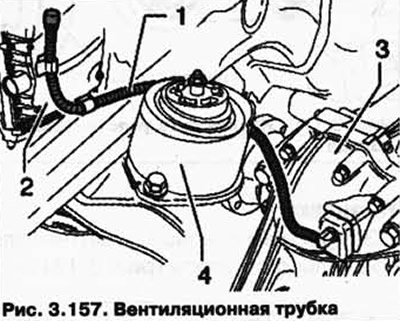 Tubul de ventilație 1 merge de la angrenajul principal din față 3 în spatele suportului de motor din dreapta 4 la filtrul de aer 2 și este prins pe acesta (figura 3.157).