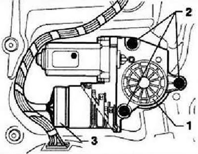 Скините облогу врата. Причврстите стакло траком да спречите да клизи надоле. Уклоните три вијка "2". Искључите конектор "3". Скините склоп мотора за подизање прозора са контролном јединицом "1" са потпорне плоче.