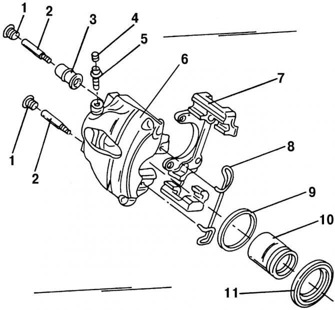 Рис. 317. Детали тормозного механизма: 1 - резиновый защитный колпачок; 2 - направляющий палец, 25 Н·м; 3 - резиновая втулка скольжения; 4 - пылезащитный колпак; 5 - штуцер для прокачки привода тормоза; 6 - тормозной цилиндр в сборе с суппортом; 7 - скоба (направляющая колодок); 8 - пружинный хомут; 9 - уплотнительное кольцо цилиндра; 10 - поршень; 11 - пылезащитное кольцо