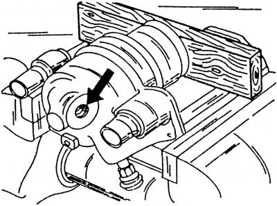 - установите под поршень деревянную накладку (рис. 318), чтобы не повредить поршень о поверхность суппорта при его выталкивании;