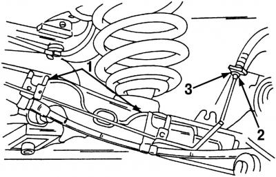 Рис. 298. Места креплений тормозных шлангов и трубопроводов на задней подвеске: 1 - хомуты; 2 - гайка трубопровода привода тормозов; 3 - крепление тормозного шланга