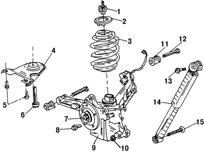 Рис. 300. Задняя подвеска: 1 - резиновый буфер, 40 Н·м; 2 - шайба крепления пружины, при установке обратите внимание на ее правильное положение; 3 - пружина; 4 - несущая плита поперечной балки; 5 - болт, 110 Н·м; 6 - болт, 170 Н·м; 7 - блок подшипника колеса; 8 - болт колеса, 140 Н·м; 9 - продольный рычаг с корпусом подшипника колеса; 10 - гайка, 140 Н·м (заменяйте всегда); 11 - втулка продольного рычага; 12 - болт (заменяйте всегда); 13 - болт (заменяйте всегда); 14 - амортизатор; 15 - болт (заменяйте всегда)