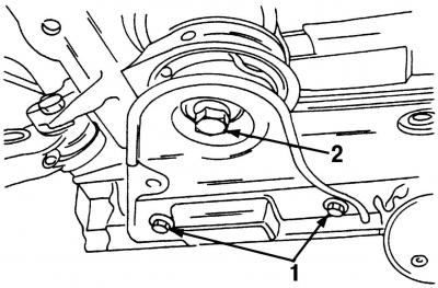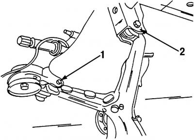 - снимите крепление заднего подрамника. Отверните оба болта 1 (рис. 301), средний болт 2 и снимите опорную плиту (рис. 302). Проведите описанные работы с обеих сторон автомобиля. На рис. 300 эти детали обозначены цифрами 4, 5 и 6.