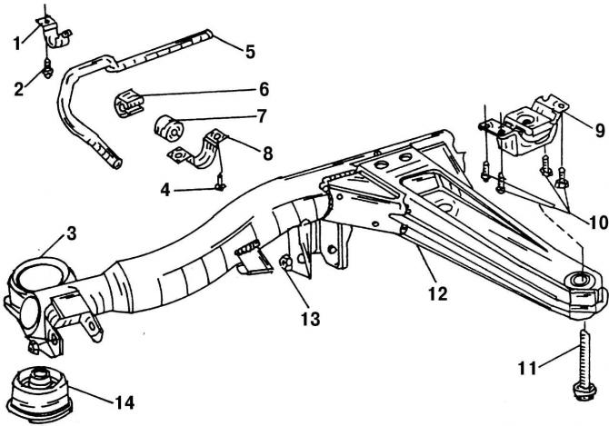 Рис. 304. Крепление поперечного рычага задней подвески и стабилизатора поперечной устойчивости: 1 - скоба крепления стабилизатора поперечной устойчивости; 2 - болт, 30 Н·м; 3 - поперечный рычаг задней подвески; 4 - болт, 30 Н·м; 5 - стабилизатор поперечной устойчивости; 6 - резиновая опора; 7 - резиновая опора; 8 - хомут стабилизатора поперечной устойчивости; 9 - опора подвески; 10 - болты, 65 Н·м; 11 - болт, 260 Н·м; 12 - поперечина; 13 - гайка, 170 Н·м; 14 - резинометаллическая опора