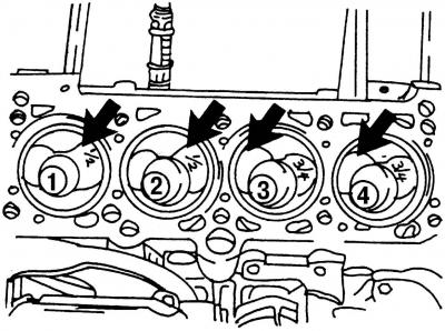 Рис. 422. Вид верхней части двигателя. Стрелками показаны большие выемки для впускных клапанов, которые по-разному расположены на поршнях № 1 и 2, № 3 и 4