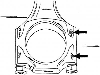 Нанесите на каждый поршень и относящийся к нему шатун тот номер цилиндра, из которого они были сняты. Лучше всего это сделать, нанеся номер цилиндра в цвете на дно поршня. Нарисуйте на дне поршня стрелку, указывающую на переднюю часть двигателя. Так как поршень может быть поставлен наоборот, т.е. повернут на 180°, то следует придерживаться рис. 422.