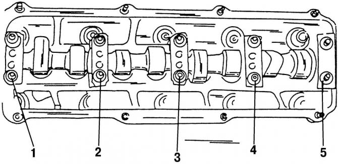 Отверните медленно и попеременно с каждой стороны крышки подшипников № 1, 3 и 5 и снимите их. Пока не откручивайте крышки подшипников № 2 и № 4.