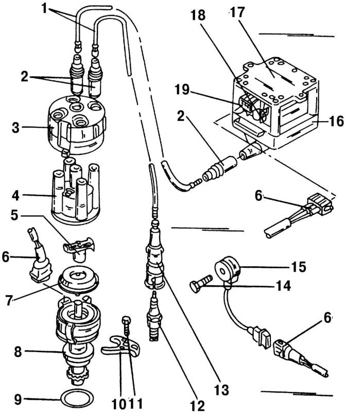 Рис. 210. Элементы системы зажигания на 2,0-литровом двигателе (с системой впрыска Simos): 1 - провод ВН, к свече зажигания; 2 - штекер подавляющий радиопомехи; 3 - защитная крышка; 4 - крышка распределителя зажигания; 5 - бегунок распределителя зажигания; 6 - трехконтактная штекерная колодка; 7 - пылезащитная крышка; 8 - распределитель зажигания с датчиком Холла; 9 - O-образное уплотнительное кольцо; 10 - прижимная рейка; 11 - болт, 25 Н·м; 12 - свеча зажигания, 30 Н·м; 13 - наконечник провода ВН, на свечу зажигания; 14 - болт, 20 Н·м; 15 - датчик детонации (G61); 16 - трансформатор высокого напряжения (N 152); 17 - выходной каскад трансформатора высокого напряжения (N157); 18 - клемма «15»; 19 - клемма «1»