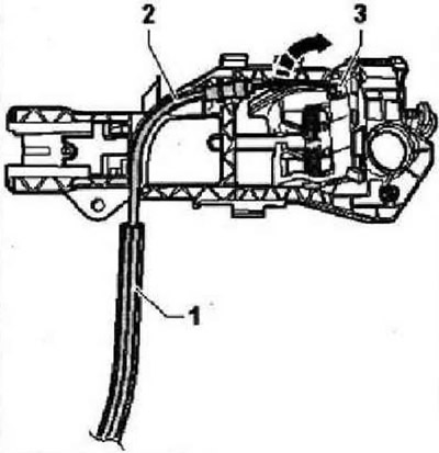 Odstráňte podporný panel. Stlačte nadol zámok "šípka a" na tele rukoväte "1". Posuňte kryt rukoväte "1" v smere "šípky b", kým nebudú upevňovacie prvky "6" a vedenie konzoly "5" úplne viditeľné. Odstráňte telo rukoväte z držiaka. Odstráňte kábel "1" z vedenia v tele rukoväte "2". Otočte kábel "1" v smere "šípky" a vyberte hrot "3" z oka.