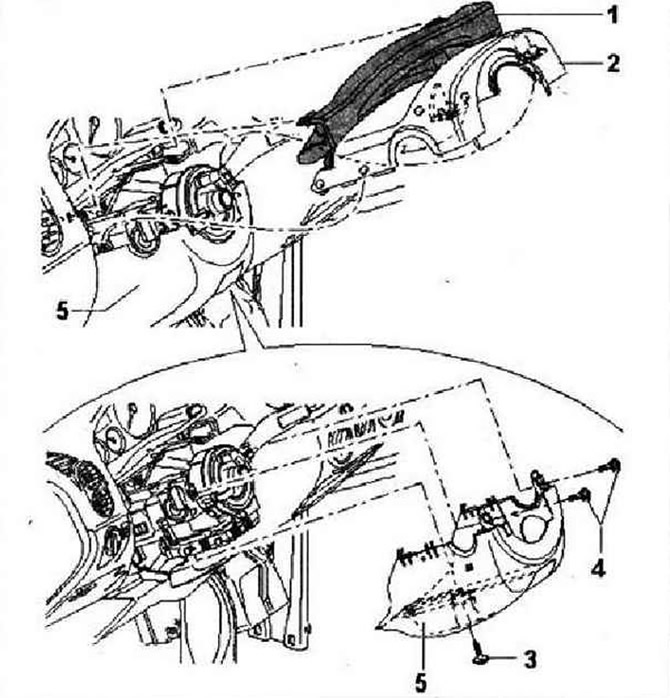 Разблокировать рычаг механизма регулирования положения рулевого колеса. Максимально выдвинуть и переместить вниз рулевое колесо. Снять отрицательную клемму с АКБ. Снять подушку безопасности водителя. Снять рулевое колесо. Разблокировать фиксаторы и снять крышку «1» и верхнюю облицовку блока подрулевых переключателей «2». Выкрутить винт «3» (1,5 Нм). Выкрутить два винта «4» (1,5 Нм). Разблокировать фиксаторы и снять нижнюю облицовку блока подрулевых переключателей «5».
