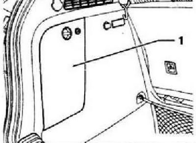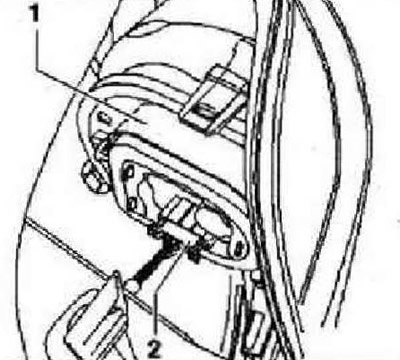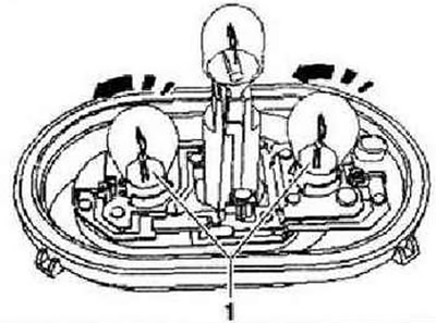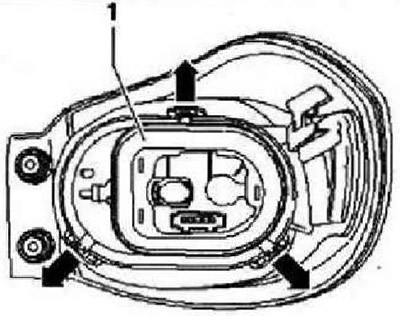 Выключить зажигание и всех потребителей электроэнергии, извлечь ключ зажигания. Снять задний фонарь в боковине кузова. Отжать фиксаторы заднего фонаря в -направлении стрелки- и снять колодку ламп «1» с заднего фонаря.