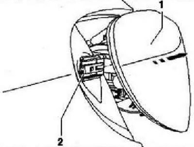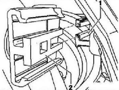 Отсоединить и разблокировать разъем «2» и снять датчик задний фонарь «1».