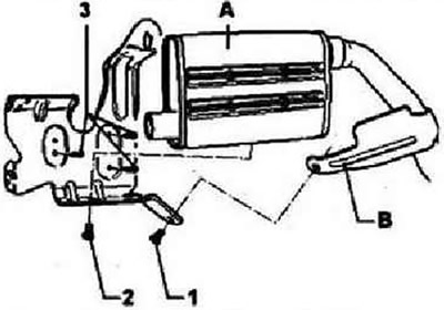 Ослабить крепления труб глушителя «А». Выкрутить винт «1» (9±1,3 Нм) на опоре «В» и отложить выхлопную трубу (концевую секцию) в сторону. Выкрутить винт «2» (8±0,8 Нм) крепления глушителя «А». Снять глушитель «А». Выкрутить винты «3» (8±0,8 Нм) крепления кронштейна. Отсоединить глушитель от центрирующих язычков и снять его. Установка осуществляется в обратной последовательности.