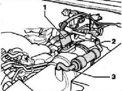 Разблокировать и отсоединить электрический разъем «1» и ослабить пружинный хомут «2» клещами -VAS 5024А- и отсоединить вакуумный шланг «3».
