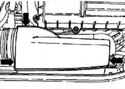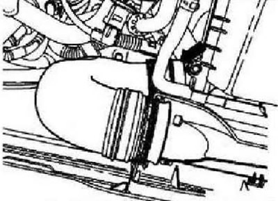 Снять шланг «стрелка» с корпуса воздушного фильтра и извлечь его из а/м. Движением вверх высвободить из резиновых опор корпус воздушного фильтра и извлечь его.