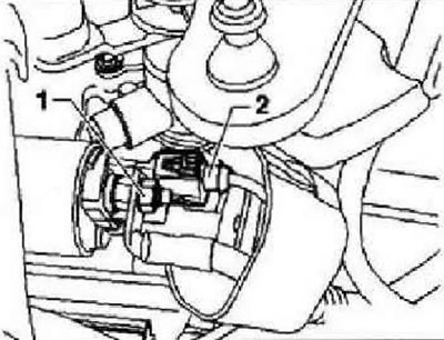 Открутить верхнюю гайку крепления «1» держателя проводов «2». Снять шумоизолирующий кожух.